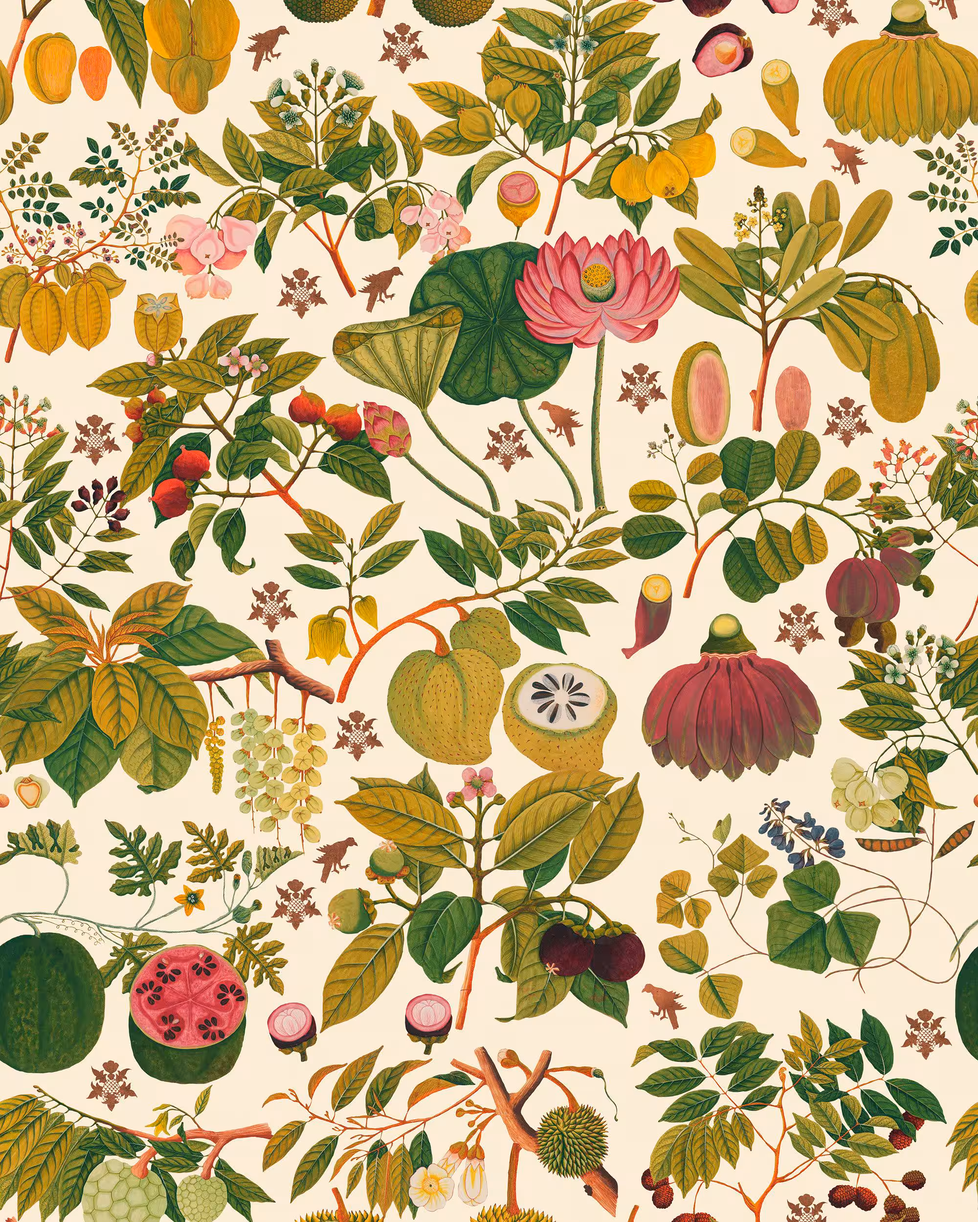 A marvelous wallpaper, on a light background, illustrating the asian fruits and flowers which can create a joyfull wall.