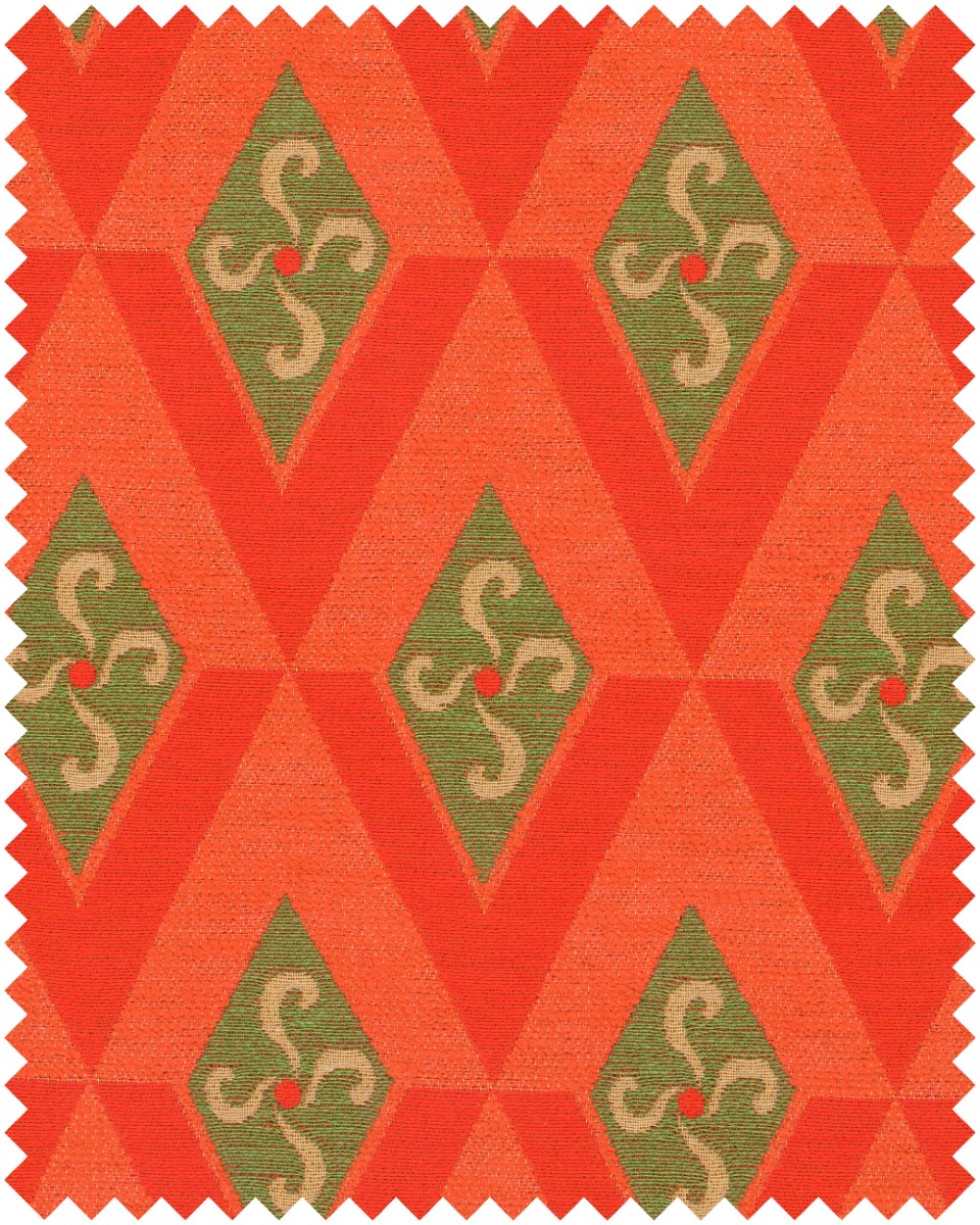 Drawing from the rhythmic undulations of reeds along the shores of Calamosche beach, repeated orange rhomboid motifs radiating warmth reminiscent of the Mediterranean sun interplay with delicate star-like motifs, evoking the tranquility of sea life. Complemented by nuanced taupe accents, the harmonious interplay of orange, green, and taupe hues creates a captivating symphony of color, evoking the serene beauty and timeless tranquility of Calamosche’s coastal landscape. Just imagine having it in your living space on your close to heart piece of furniture or adorning your windows.