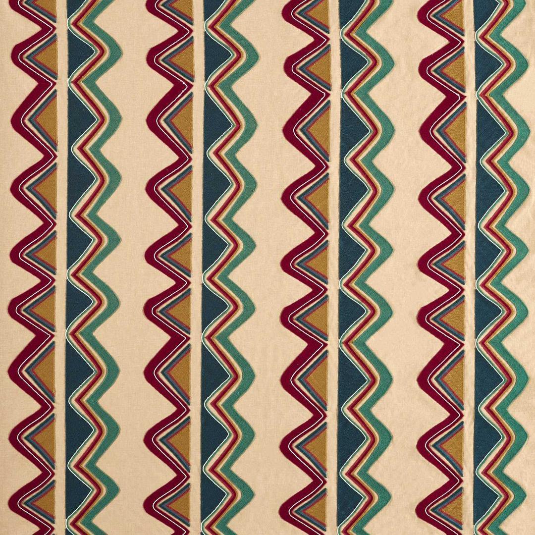 A crewel stitch reveals a zig-zag stripe in a sophisticated way, referencing border designs discovered during the studio’s exploration of inspiration for the Zamora collection. Three colourways are available.